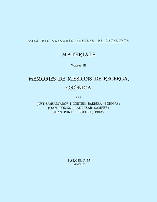 • Obra del Cançoner Popular de Catalunya. Volum III. Memòries de missions de recerca, crònica