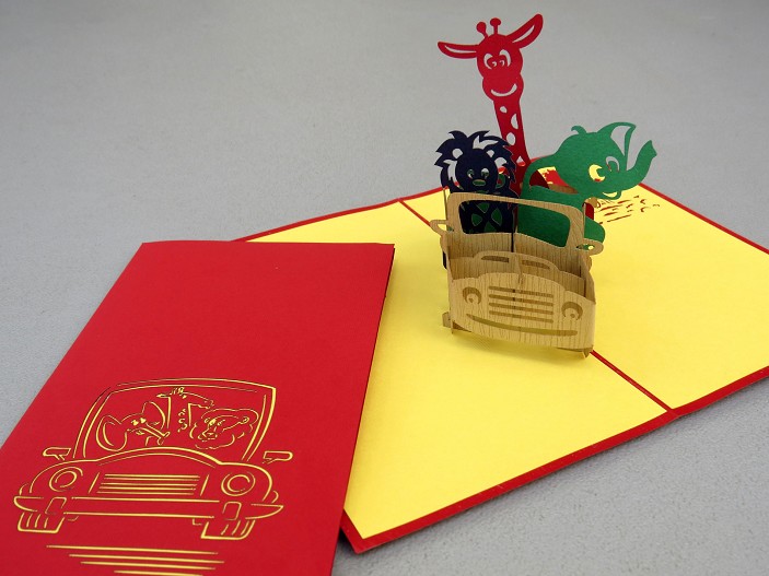 Un elefante, un león y una girafa se pasean en su 4x4 por la selva. Súbete con ellos y descubre los animales escondidos entre las hierbas y detrás de los arboles.