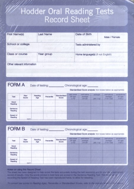 • HODDER ORAL READING TESTS: RECORD SHEET PK10